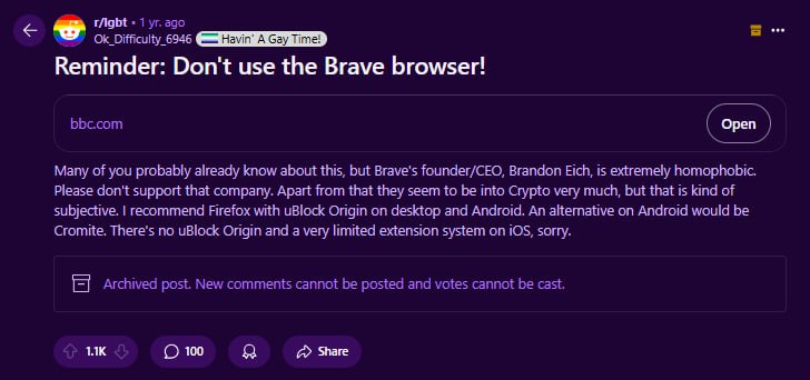 Автор этих статей является труном, у которого уже не один год подгорает из-за Брендана Эйха, основателя Брейв. Подгорает по причине того, что Брендан является сторонником традиционных ценностей и не терпим к ЛГБТ. По этой причине, кстати, он и ушел с поста руководителя компании мазила, а позже основал Брейв.