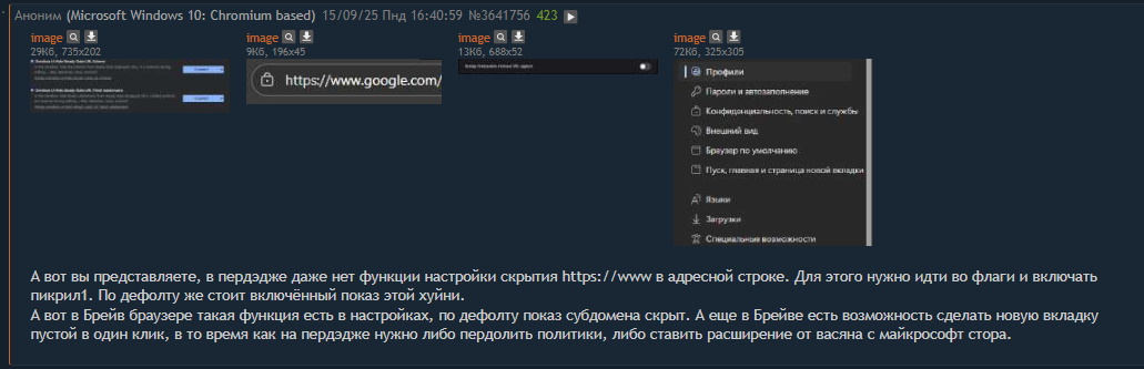 >>1076389 >Brave — это браузер-«рекламная платформа». «Sponsored Images» лезут в новый таб (каждый четвёртый по умолчанию), плюс свои Brave Ads за BAT-копейки. Ну вы поняли: «приватность, но с рекламой». Ты скозал? Тогда не удивительно, что ты высрал такую хуетень. >платный «браузерный VPN» за $9.99 в месяц. В Zen VPN не продают — ставь любой нормальный аддон или системный клиент и катайся. Троллинг тупостью? Будто в брейв невозможно поставить расширение ВПН'а. >«Ой, мы случайно подменили адреса партнёрскими рефами»: автодобавление аффилиаток к биржам и извинения постфактум. Обоссан в шапке треда. >Tor-окно» в Brave уже ловили на утечках .onion-запросов мимо Tor — фиксы выкатывали, но осадочек остался. Для анонимного серфинга лука существует Тор браузер, слыхал? Это, кстати, единственный не каловый браузер на геко. >Manifest V3 душит нормальные блокировщики на всём хромиуме. Нейробред.