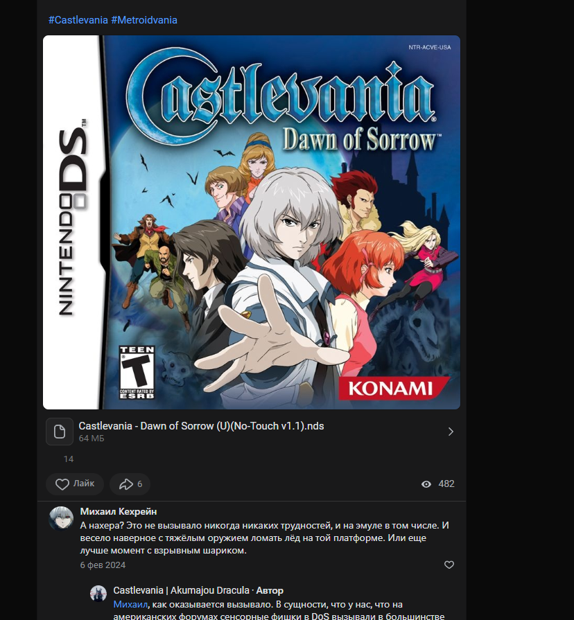 В одной из частей Кастлы для NDS Dawn of Sorrow есть трудности с точным вводом каких-то рун при том что игра почти полностью пригодна для игры на одно экранных девайсах типа miyoo mini plus, и вот значит есть хакнутая версия где отключена эта механика ром можно взять тут https://m.vk.com/wall-11130677_4909