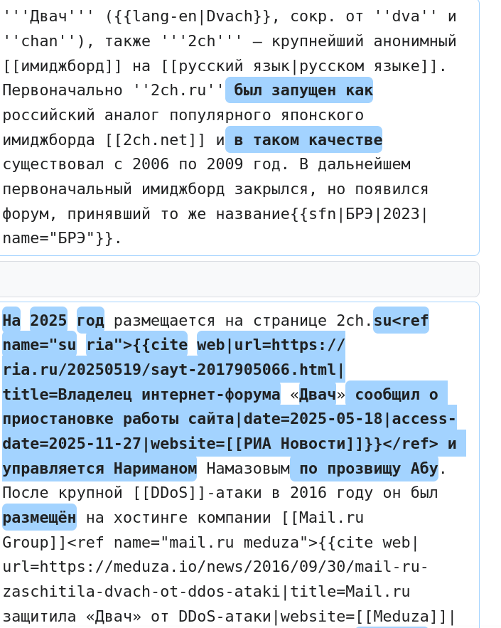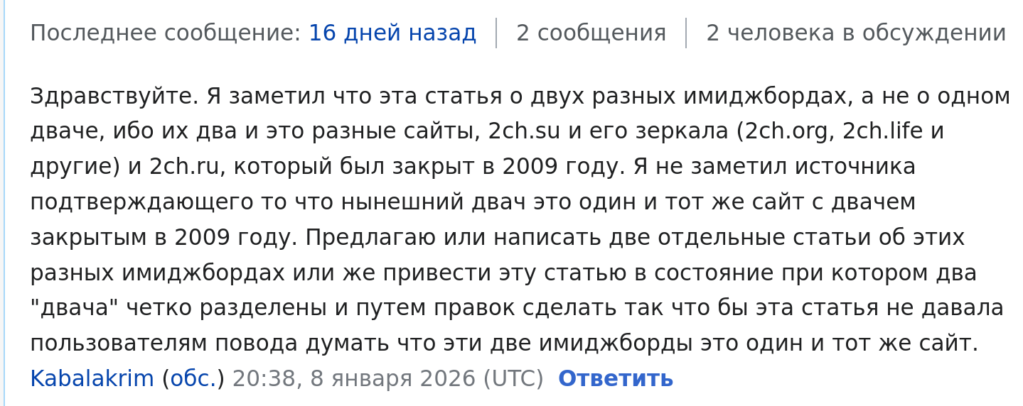 Страничка в вики была удалена, но в конце 2025 ее снова создали, с текстом что на сосаче размещается двач.